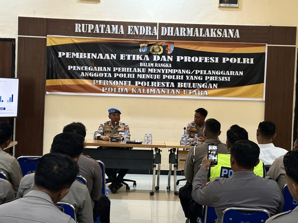TANJUNG SELOR-Bertempat di Ruang Rupatama Endra Dharmalaksana Polresta Bulungan, telah dilaksanakan kegiatan resmi pembinaan etika dan profesi anggota Polri. Kegiatan ini dipimpin langsung oleh Kepala Bidang Profesi dan Pengamanan (Kabid Provam) Polda Kalimantan Utara, Kombes Pol. Krishadi Permadi, bersama dengan Kapolresta Bulungan, Kombes Pol. Rofikoh Yunianto, beserta pejabat utama Polresta Bulungan.Senin 20/10/2025.